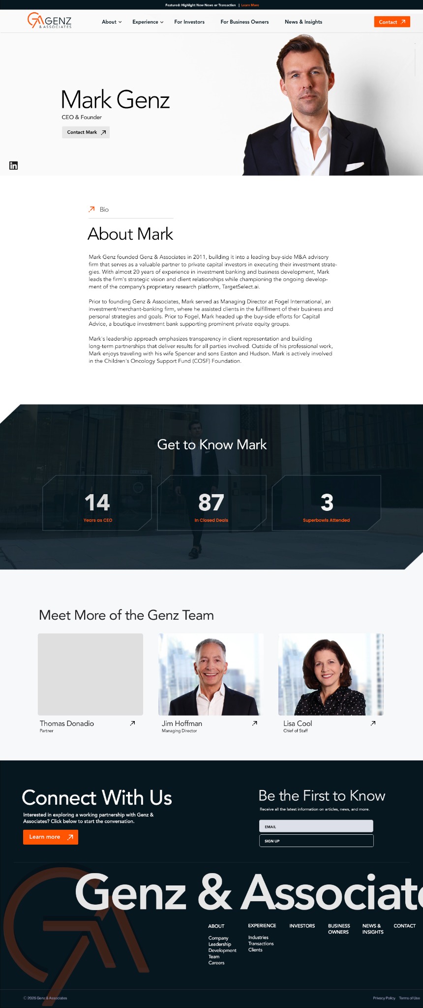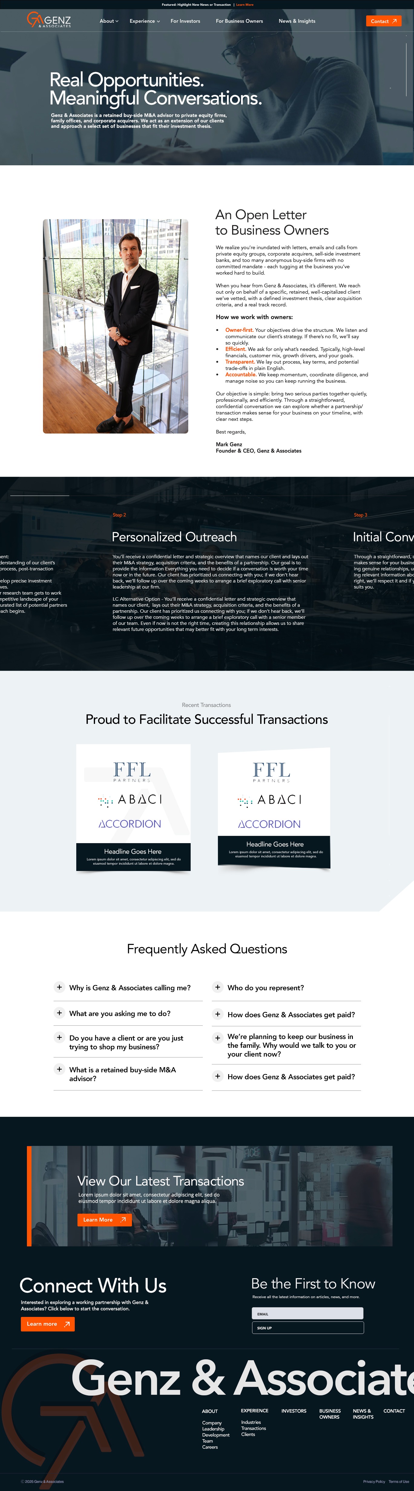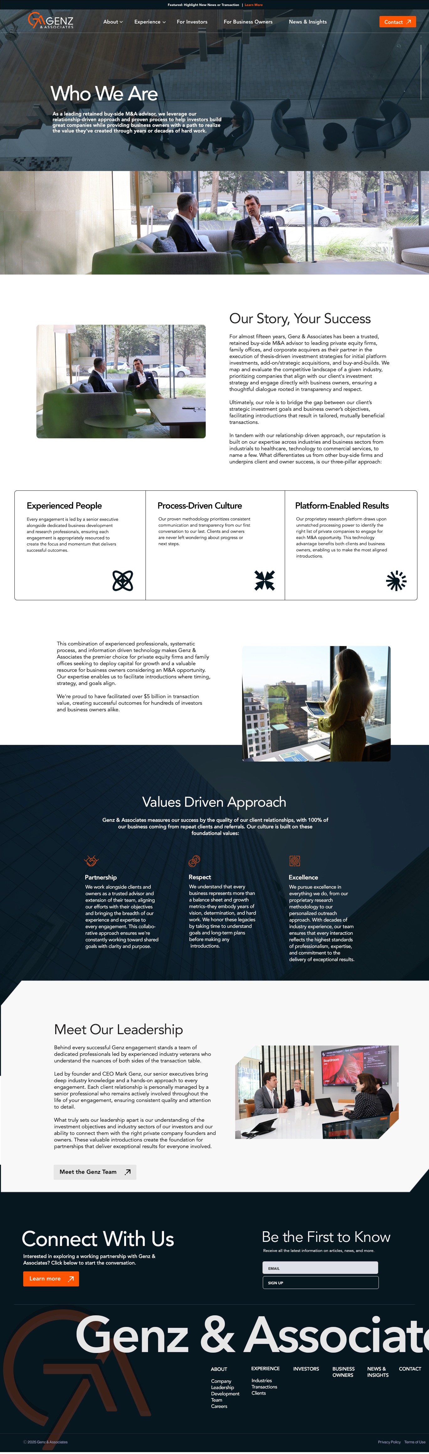 Genz & Associates needed a complete website rebrand that would effectively communicate their specialized buy-side M&A advisory approach to two distinct audiences. As a boutique firm serving private equity firms and business owners simultaneously, they required messaging that would differentiate their targeted, systematic methodology while establishing credibility with sophisticated investors seeking to deploy significant capital and business owners evaluating potential transactions. The rebrand also needed to clearly articulate dual value propositions while showcasing their proven track record of facilitating successful deals between these complementary audiences across multiple industry sectors.