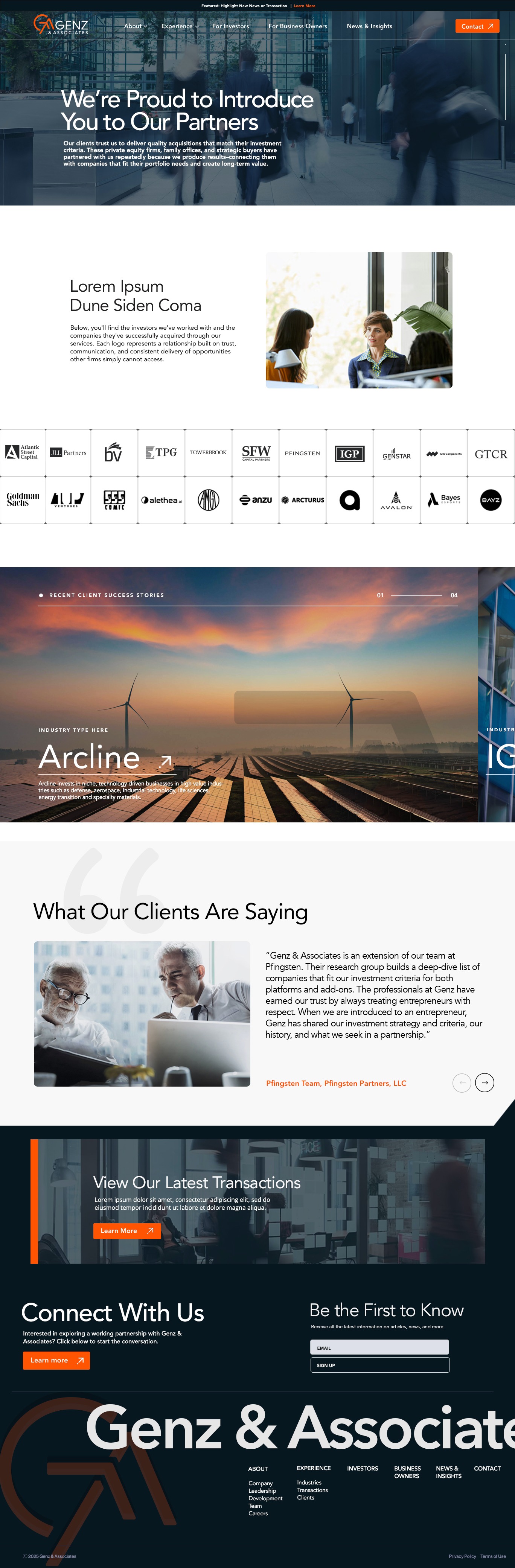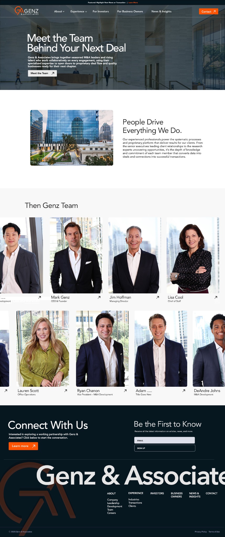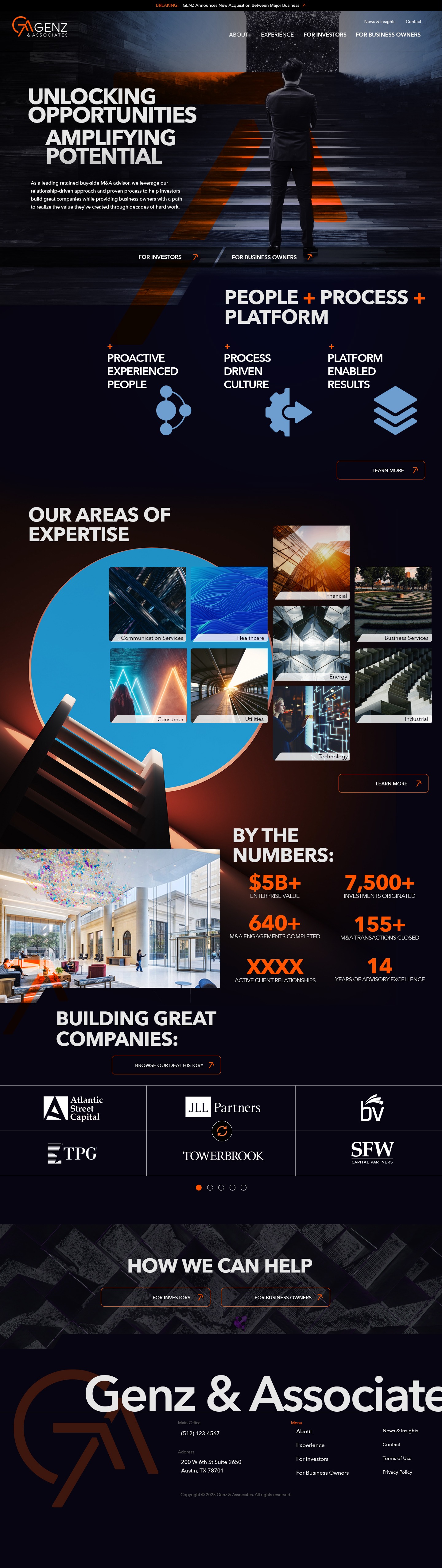Genz & Associates needed a complete website rebrand that would effectively communicate their specialized buy-side M&A advisory approach to two distinct audiences. As a boutique firm serving private equity firms and business owners simultaneously, they required messaging that would differentiate their targeted, systematic methodology while establishing credibility with sophisticated investors seeking to deploy significant capital and business owners evaluating potential transactions. The rebrand also needed to clearly articulate dual value propositions while showcasing their proven track record of facilitating successful deals between these complementary audiences across multiple industry sectors.